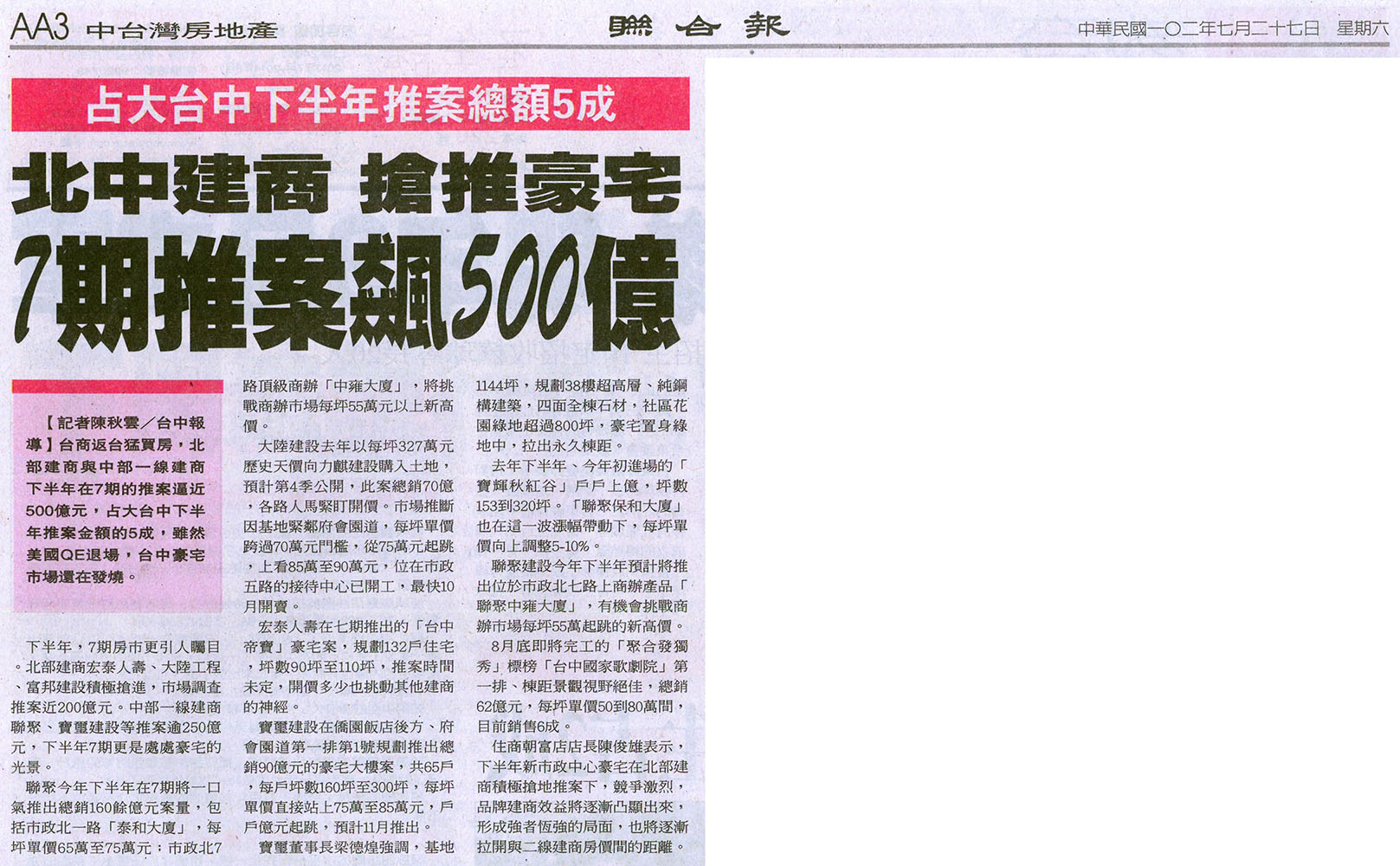 [聯合報] 北中建商 搶推豪宅 7期推案飆500億 ...