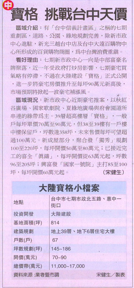 [經濟日報] 寶格挑戰台中天價 ...